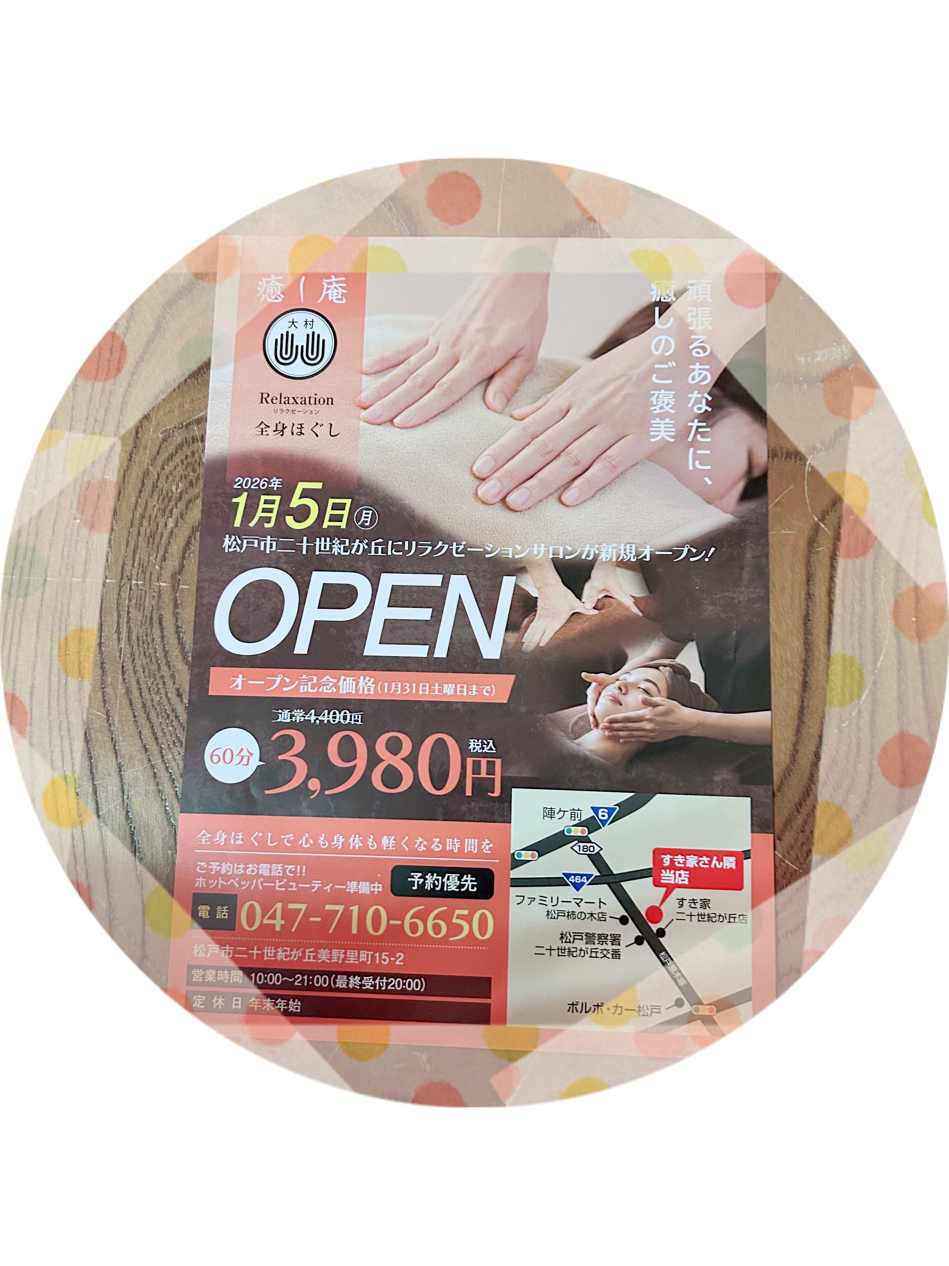 大好評につき チラシを持参の方 全身ほぐし60分コース 4400円を 3980円で施術させて頂きます😊👍 店の前にもチラシ置いてあります
